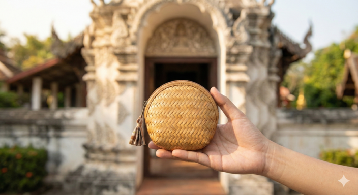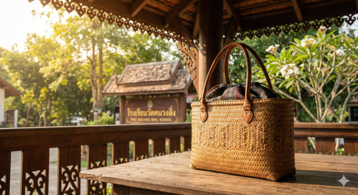 กระเป๋าถือสตรีไม้ไผ่จักสาน กระเป๋าถือดีไซน์ทันสมัย ผสมผสานงานจักสานไม้ไผ่ละเอียดกับผ้าไทยและหนังแท้ วางอยู่บนระเบียงไม้ของอาคารเรียนสถาปัตยกรรมล้านนาท่ามกลางแสงแดดอุ่น